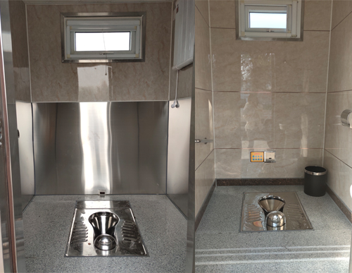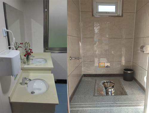 室內(nèi)配置:不銹鋼蹲便器、火燒板防滑地面、化妝鏡、衣帽鉤、手紙盒、廢紙簍、照明燈、排風(fēng)扇、指示牌等。