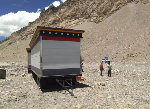 珠峰大本營拖車式太陽能型環保廁所已經建成投入使用了。為大本營的登山愛好者和游客們提供了良好舒適的如廁環境。整體廁所設計藏族風格簡潔大方。太陽能廁所采用泡沫封堵型處理工藝。