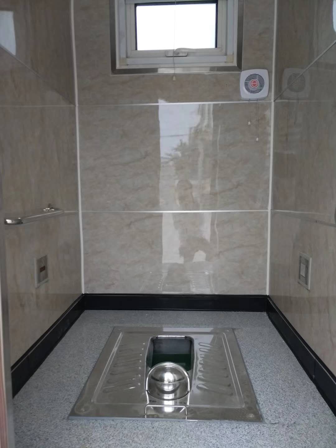 室內配置:不銹鋼水沖蹲便器、火燒板防滑地板、化妝鏡、衣帽鉤、手紙盒、廢紙簍、照明燈、換氣扇、指示牌等。