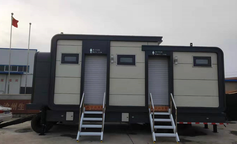 首先來說說這座廁所的外觀,整座廁所分為男衛生間、女衛生間以及管理間,由4輪拖車配合拖杠形成,全部由裝配式鋼結構框架拼合而成,外部由鋁塑板包邊復合,從外觀來看十分大氣美觀。男女衛生間的門屬于智能plc控制的感應電動門,使用者可以通過接觸智能感應開關開啟廁門。