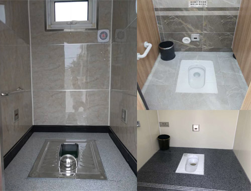 室內配置:不銹鋼蹲便器、火燒板防滑地板、化妝鏡、衣帽鉤、手紙盒、廢紙簍、照明燈、換氣扇、指示牌等。